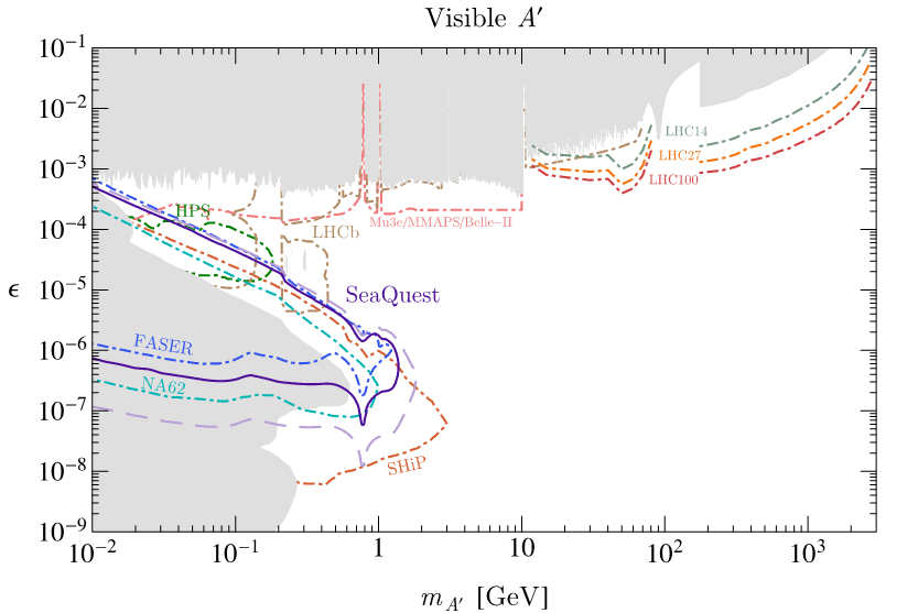 Figure 1: Reach for visible dark photons at past (in gray), at present/future fixed target experiments (curves at low values of the portal coupling, ε) as well as at Belle-II (in light red), at LHCb (in brown) and at high-energy colliders (red, orange, and green curves at high mass). Adapted from [Berlin:2018pwi] (we thank A. Berlin for the figure).