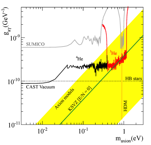 In the CAST helioscope the signal of axions would have emerged as an excess of counts of the X-rays detectors within the beam spot when the magnet was pointing to the sun and the background remained constant outside of the beam spot. Operating the experiment with either empty bores or filled with 3He or 4He, respectively, at varying densities allowed for scanning different mass regions of the axion phase space. CAST was able to constrain the axion-photon coupling constant from the very low up to the hot dark matter sector. The search range now generously overlaps with the current cosmic hot dark matter bound of ma ≲ 0.9 eV and there would be little benefit in pushing to yet larger masses with the buffer-gas technique as it is shown in Figure 1.