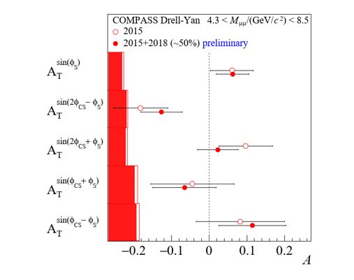 A key component and an unprecedented feature of the COMPASS physics programme is the study of TMD PDFs of the nucleon via the measurement of spin- (in)dependent azimuthal asymmetries in both semi-inclusive DIS (SIDIS) and DY processes. The first ever spin-dependent Drell-Yan measurement was performed in 2015. The measurement of the Sivers asymmetry and all other transverse spin-dependent azimuthal asymmetries was performed at a comparable hard scale in both SIDIS and DY at COMPASS. Comparing the results of these measurements offers the unique possibility to test the predicted universal and process-dependent features of TMD PDFs by using essentially the same experimental setup. The first DY results based on the 2015 data were published in PRL 119 (2017) 112002. The observed Sivers asymmetry is found to be consistent with the QCD TMD-framework prediction. In order to improve the statistical precision of the result, in 2018 the COMPASS data-taking campaign was again devoted to spin-dependent DY measurements and preliminary results have been shown already (see figure below).