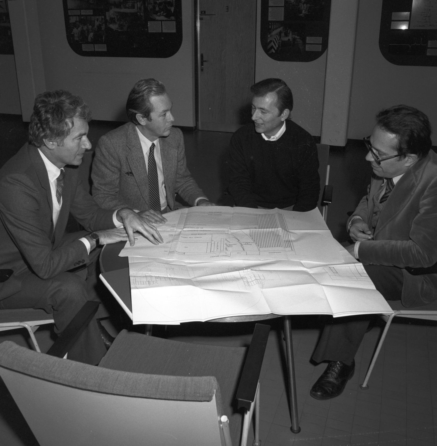 Discussion on the DELPHI, one of the four LEP experiments (December 1981): Around the table from the right: Guido Petrucci, Hans Jurgen Hilke, Ugo Amaldi, and Gregoire Kantardjian (Credits:CERN).