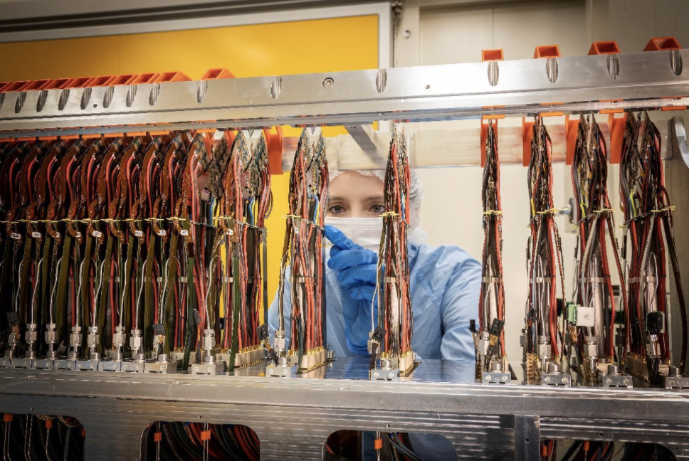 Key components of the VELO have already been installed or refurbished and upgraded: CO2 cooling plant, electronics, the data links from the vacuum vessel to the control room, foils, and the motion and vacuum systems. A major milestone was passed when module production began in November 2021 by the production centres at the University of Manchester and Nikhef. The detector modules were sent to Liverpool for assembly onto their mechanical supports, and cooling pneumatics. Mounting and connection to their service umbilicals is performed at the Liverpool Semiconductor Detector Centre (LSDC). There, the detector halves are fully tested for functionality, safety and pre-commissioned for installation at LHCb. The collaboration provides vital support at the assembly site and, where necessary, remote expertise and troubleshooting.