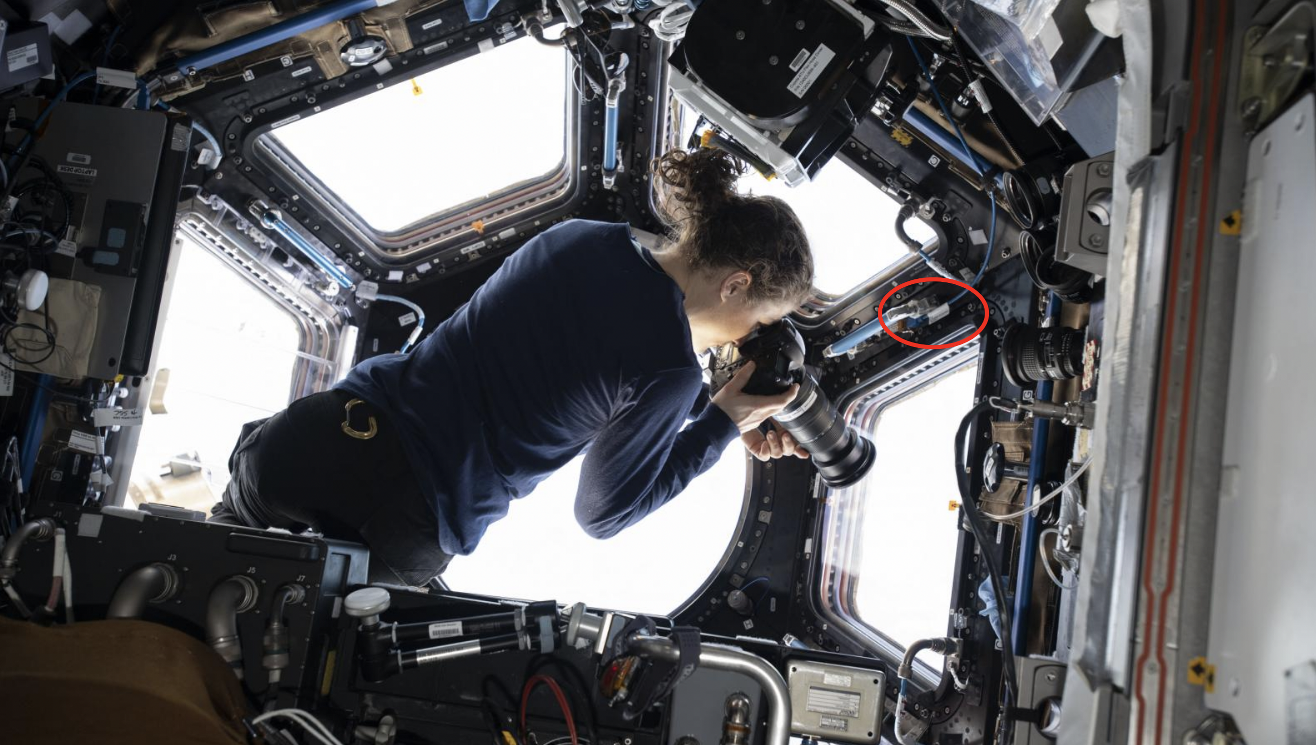An astronaut photographing earth from the cupola of the International Space Station. The Timepix device (circled in red) is recording the radiation dose of the crew. Photo courtesy of NASA.